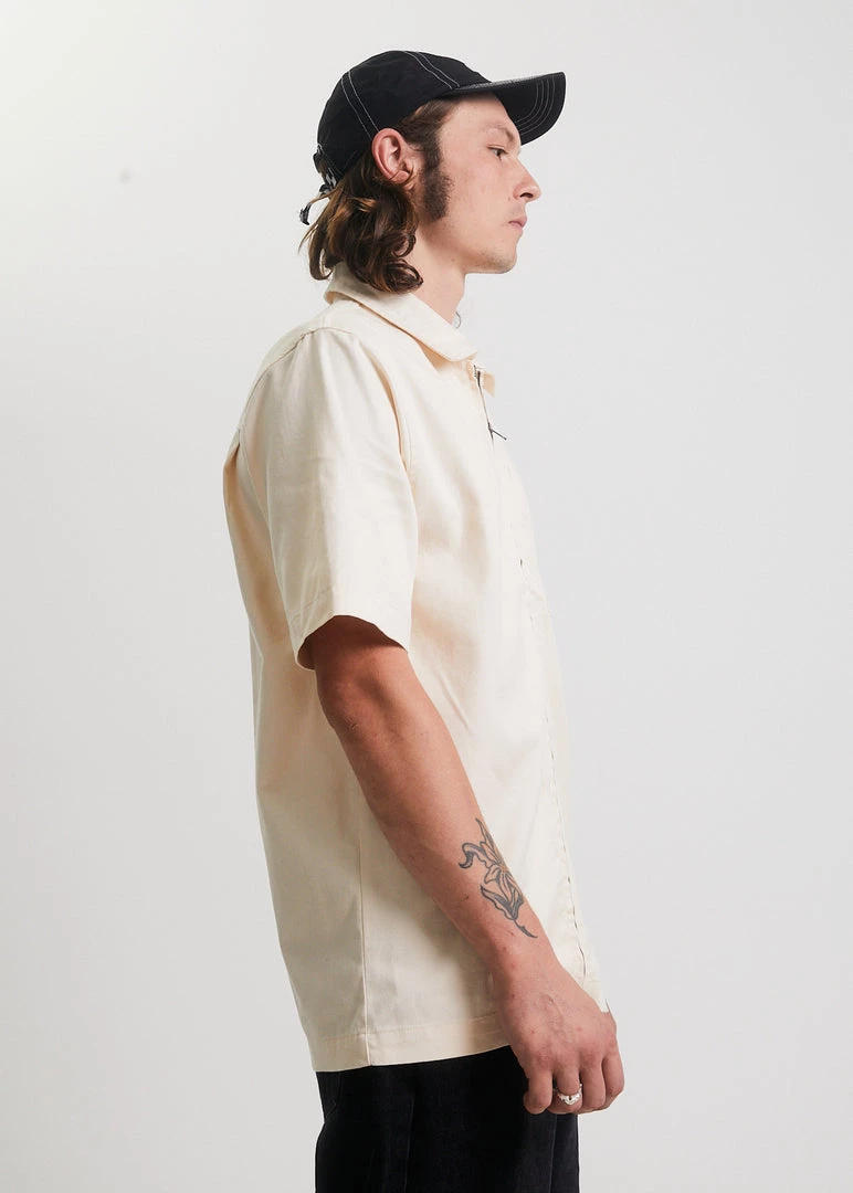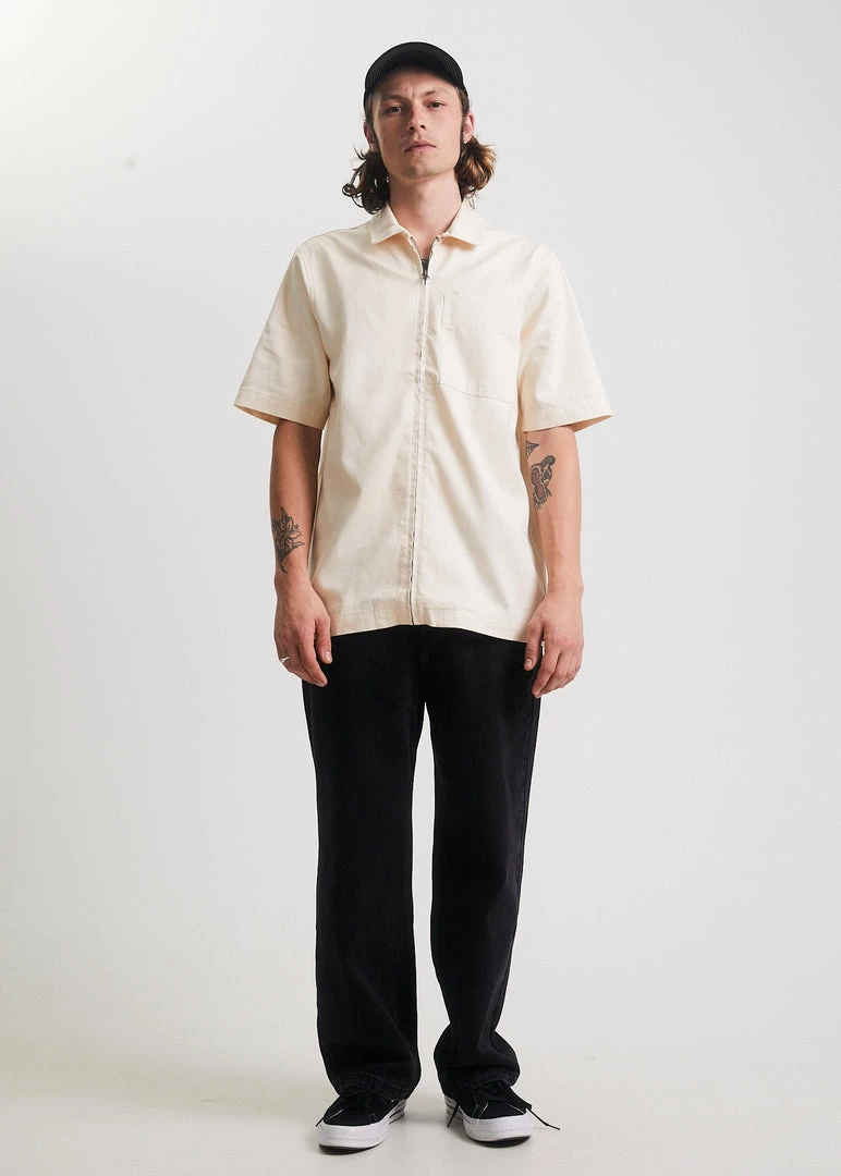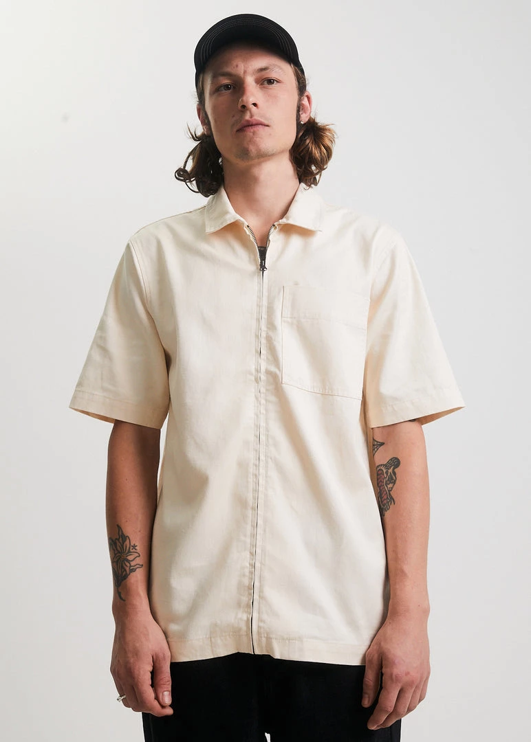 Our short sleeve shirt offers a relaxed and durable design with a zip-up front, collar and single chest pocket in eco-friendly hemp and organic cotton twill.