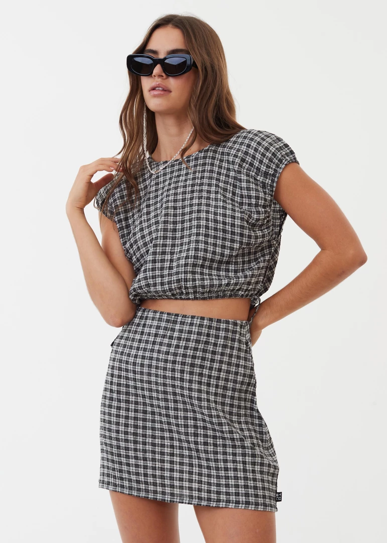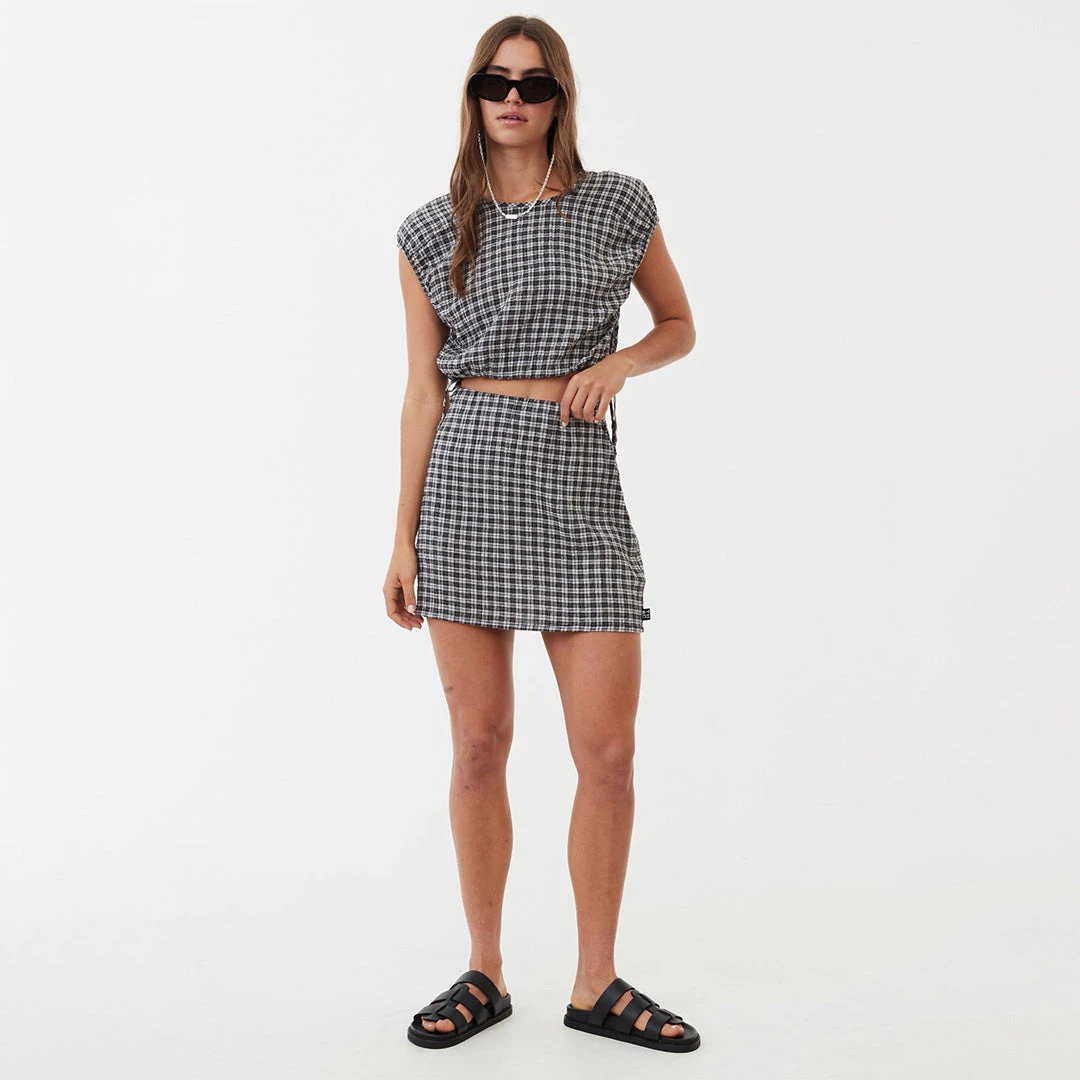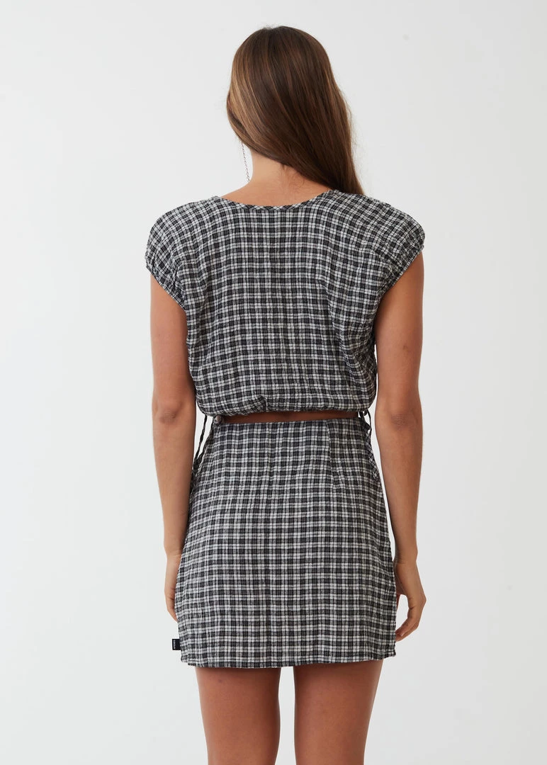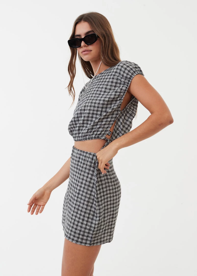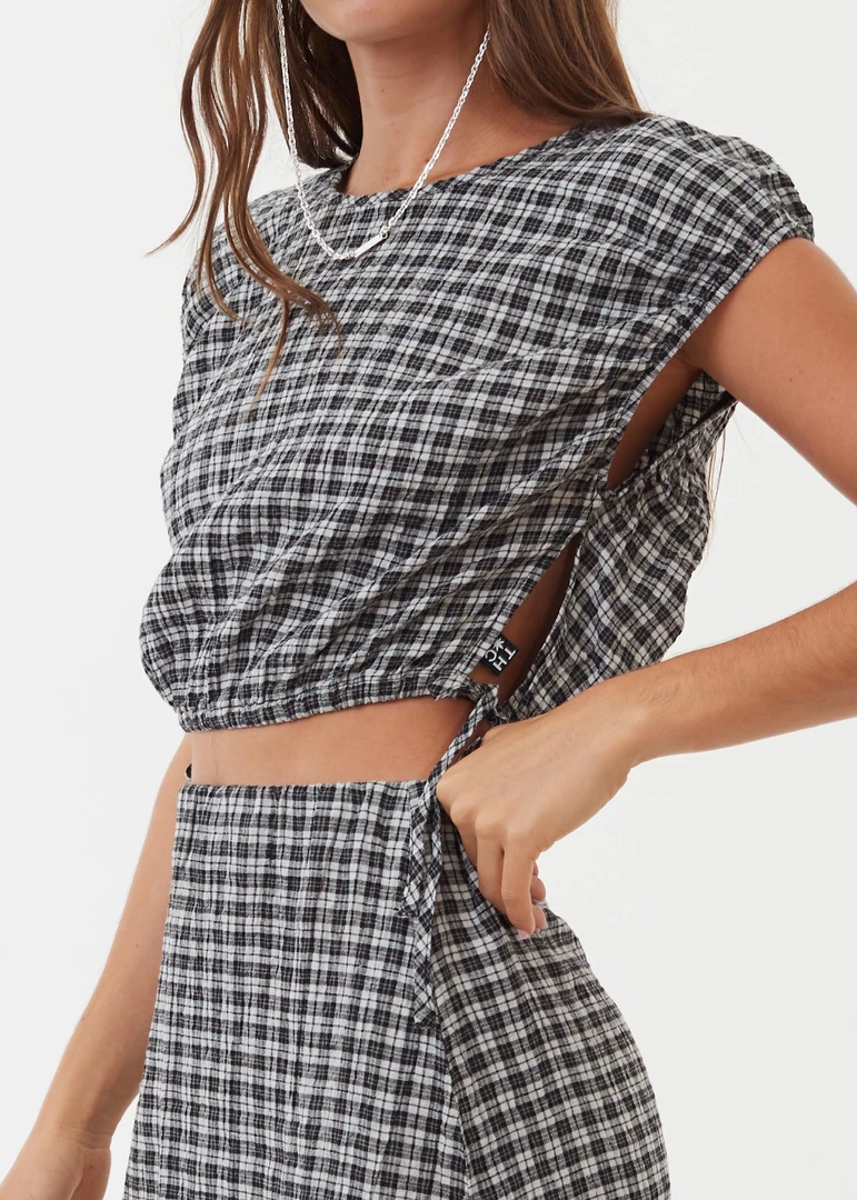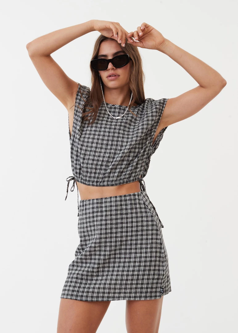 Feel a bit femme in this cropped tie top. Crafted from lightweight hemp and tencel check seersucker fabric and cut in our cropped silhouette with capped sleeves and side ties to cinch the waist to your liking, you pair it with the matching skirt to go from day to night with ease.