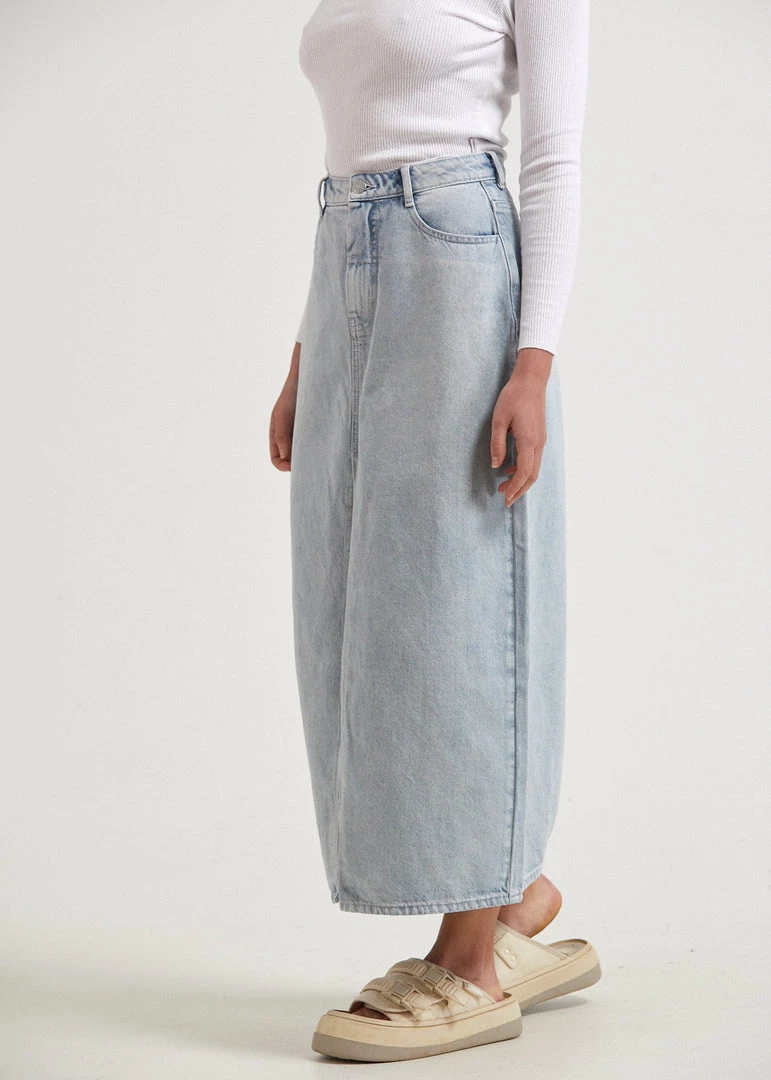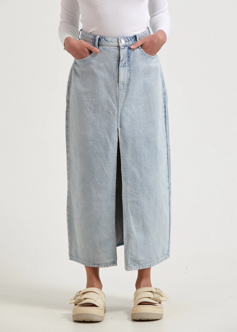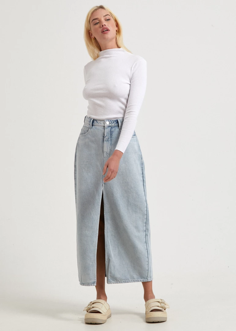 Show a little leg in this midi skirt. Our new skirt design features a high-rise waist, A-line cut and slit up the front for ease of movement. Crafted from eco-friendly organic cotton and hemp denim, this skirt offers a premium, midweight and durable design to see you through the seasons with ease.