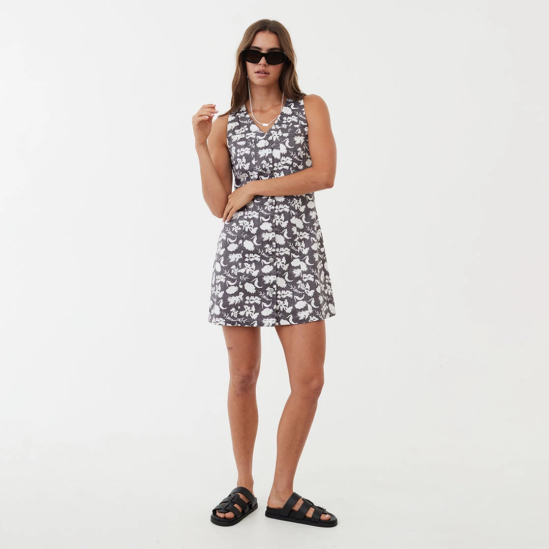This printed mini dress is the ultimate statement piece in eco-friendly and enduring hemp canvas printed with artwork by Bayley KK. The button-up front, mini length and collared design create a transeasonal piece that can be worn alone or layered with a long sleeve for year-round wear.