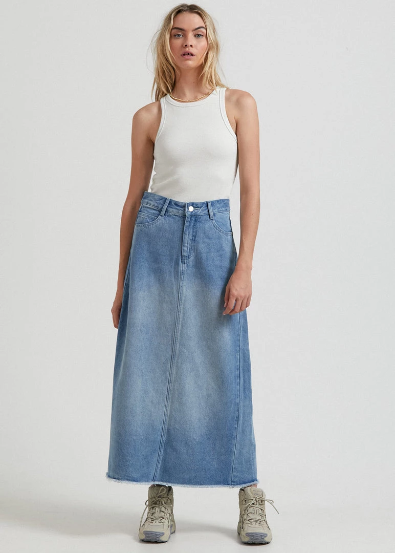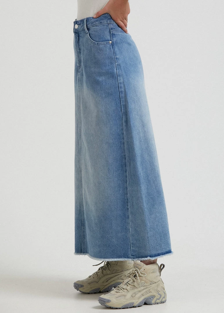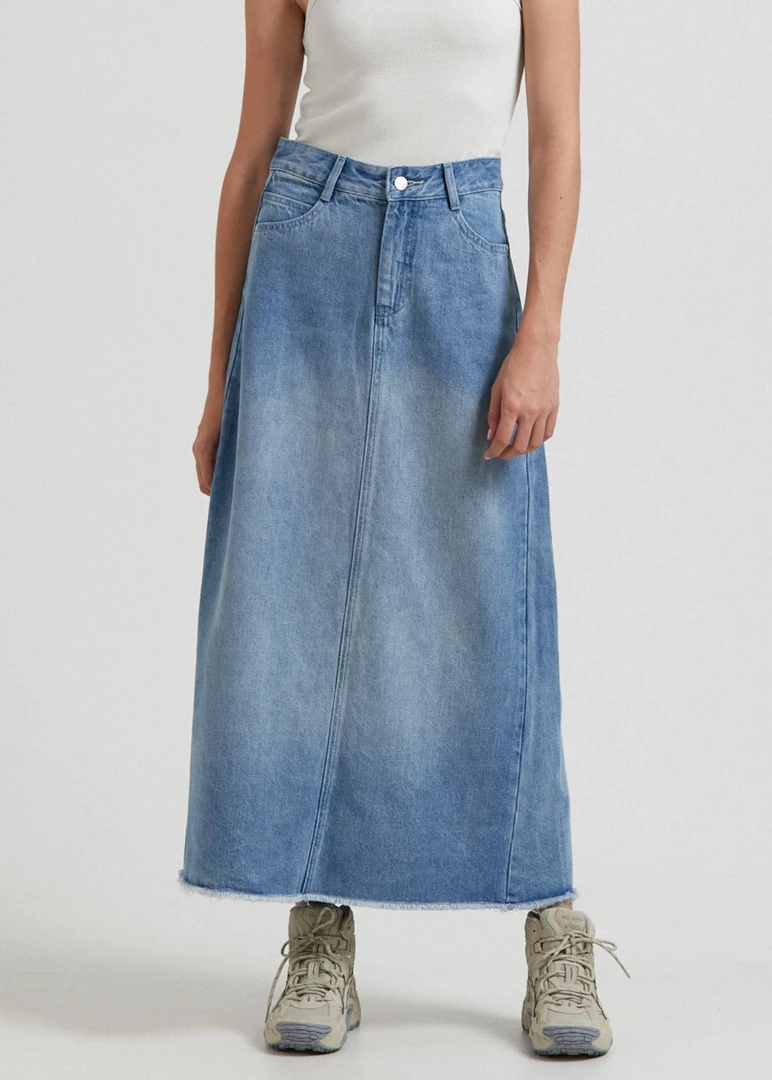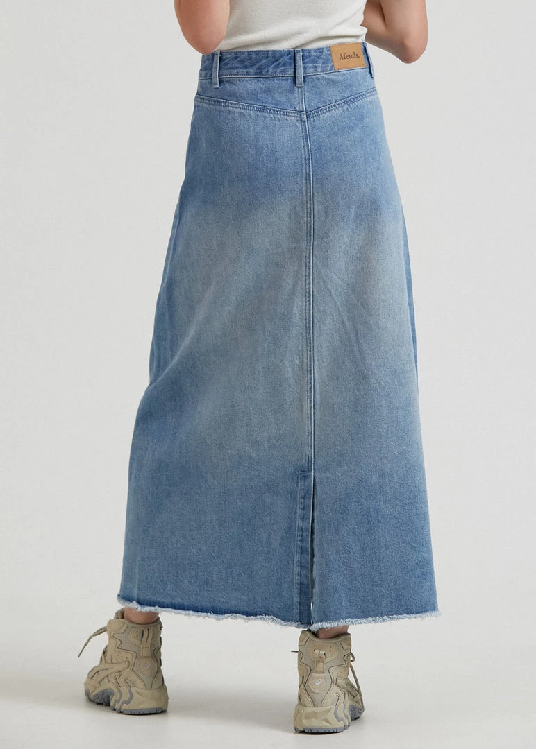 Show off your new skirt. Crafted from the innovative blend of organic cotton and hemp denim – this worn blue skirt offers a midweight and rigid design reminiscent of vintage denim. Our midi-skirt silhouette has a flattering high-waisted A-line shape with a 90s-inspired flared hem and a small slit in the back for a little extra breathing room.