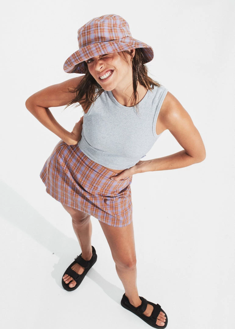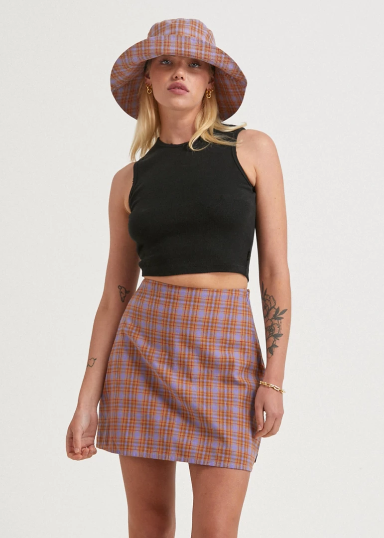 This mini skirt will keep you in check. Crafted from eco-friendly hemp and tencel, this skirt offers a super soft, lightweight and breathable design in our custom plaid print. Following our classic high-waisted mini silhouette, this skirt has a flattering fit and seamless design with an invisible side zip entry.