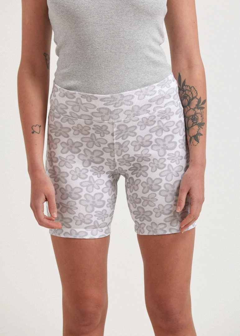 Feel a little bit girly in these ribbed bike shorts. Where grunge meets femme comes our latest print, a playful take on the classic floral print designed by Ava Steiner. Our bike shorts offer a high waisted, supportive fit and durable design in recycled cotton rib. Pair them with the matching tank for a bit of fun.