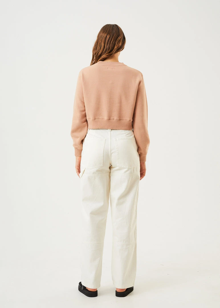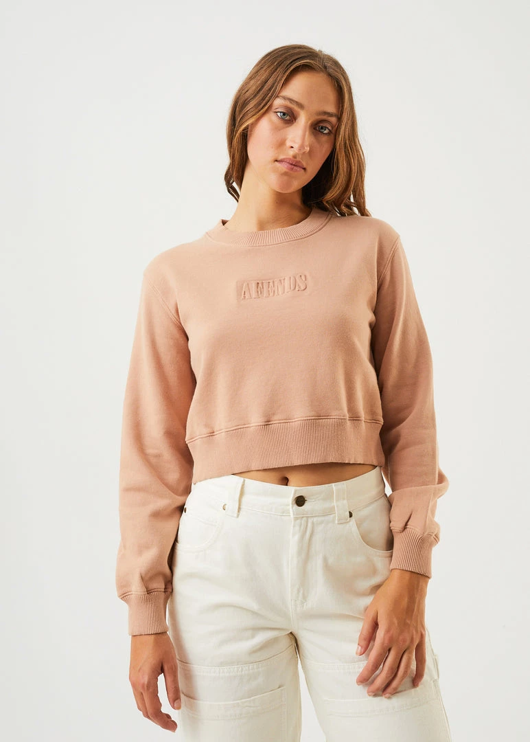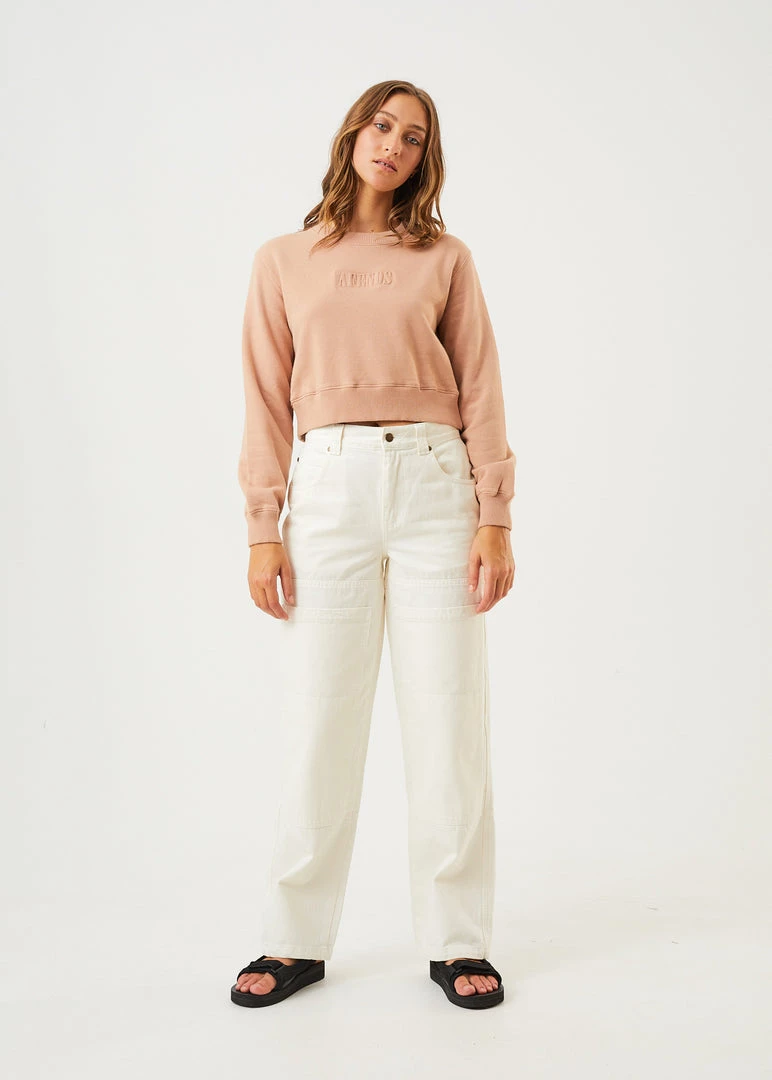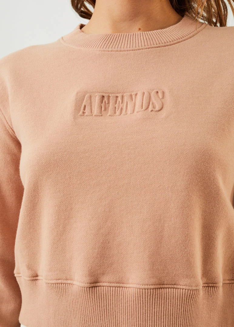 Feeling that Love Buzz. Get cosy in our box fit crew jumper made from super soft 100% cotton brushed fleece. The mid-length jumper is detailed with ribbed neck, cuffs and waistband and finished off with tonal embossed Afends logo across the front.