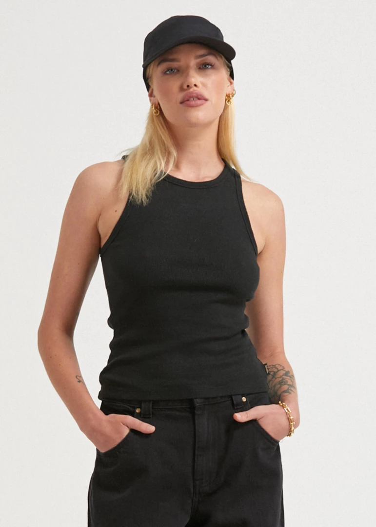 Get back to basics in this ribbed singlet. Our eco-friendly blend of recycled poly and hemp rib offers a slight stretch with a textured and heavyweight hand-feel. This new singlet shape features a sleek and feminine shape with a soft and scooped neckline. longline silhouette and semi racer back style. In a duo of timeless colours, Lydia embodies sustainable simplicity.