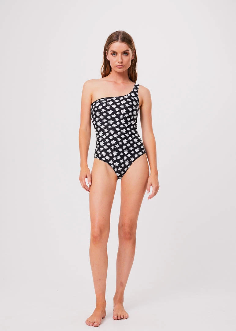 Pretty is in this pascale swimsuit. Our new swim shape offers a flattering one-shoulder design, slightly cheeky cut and palm-tree print created in collaboration with Franny Badger.