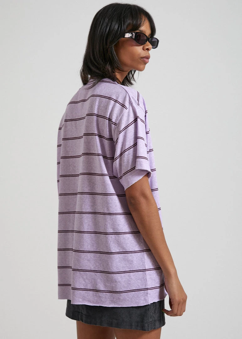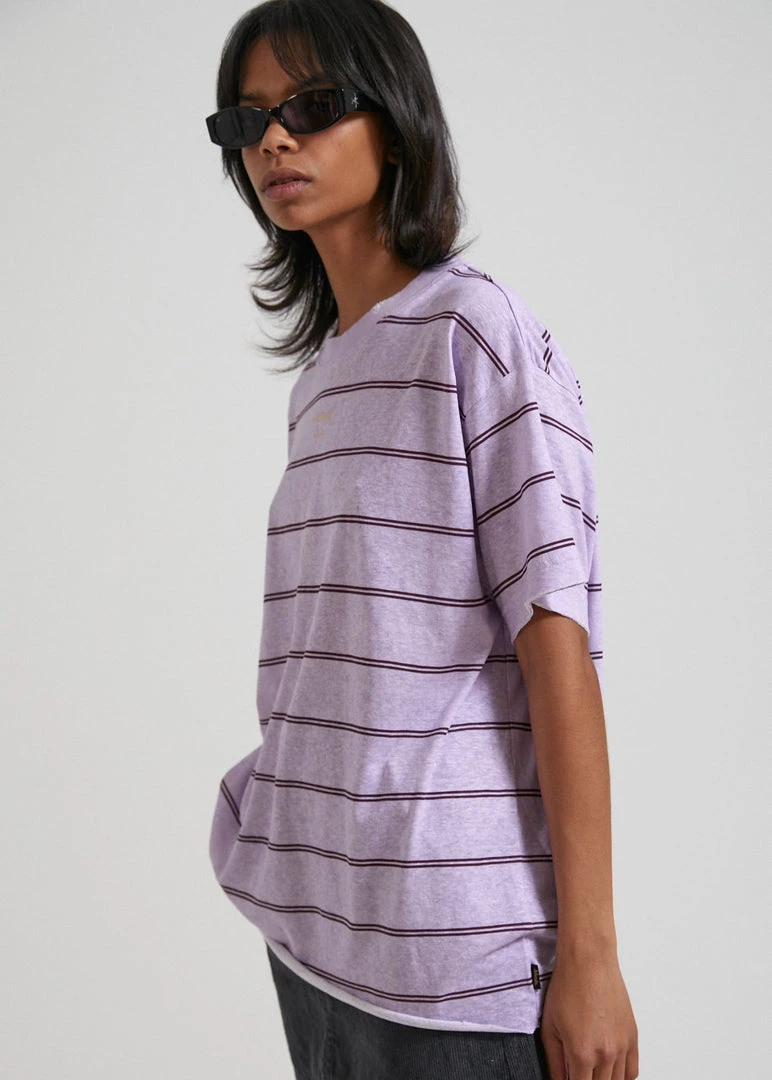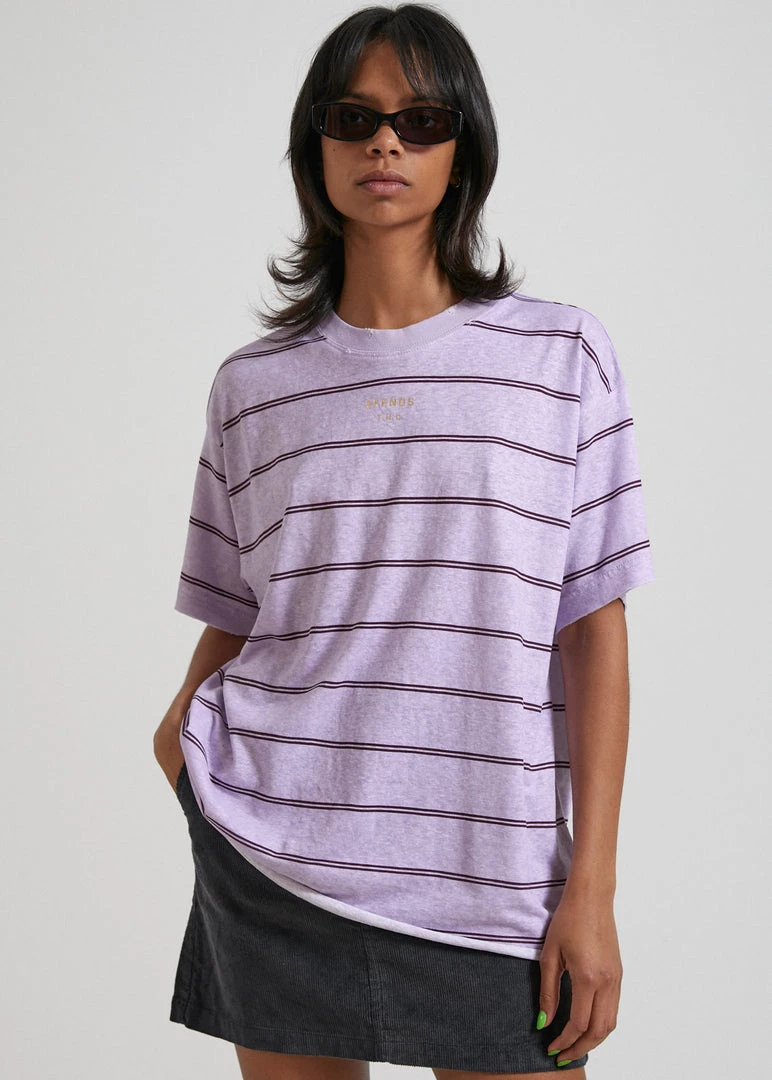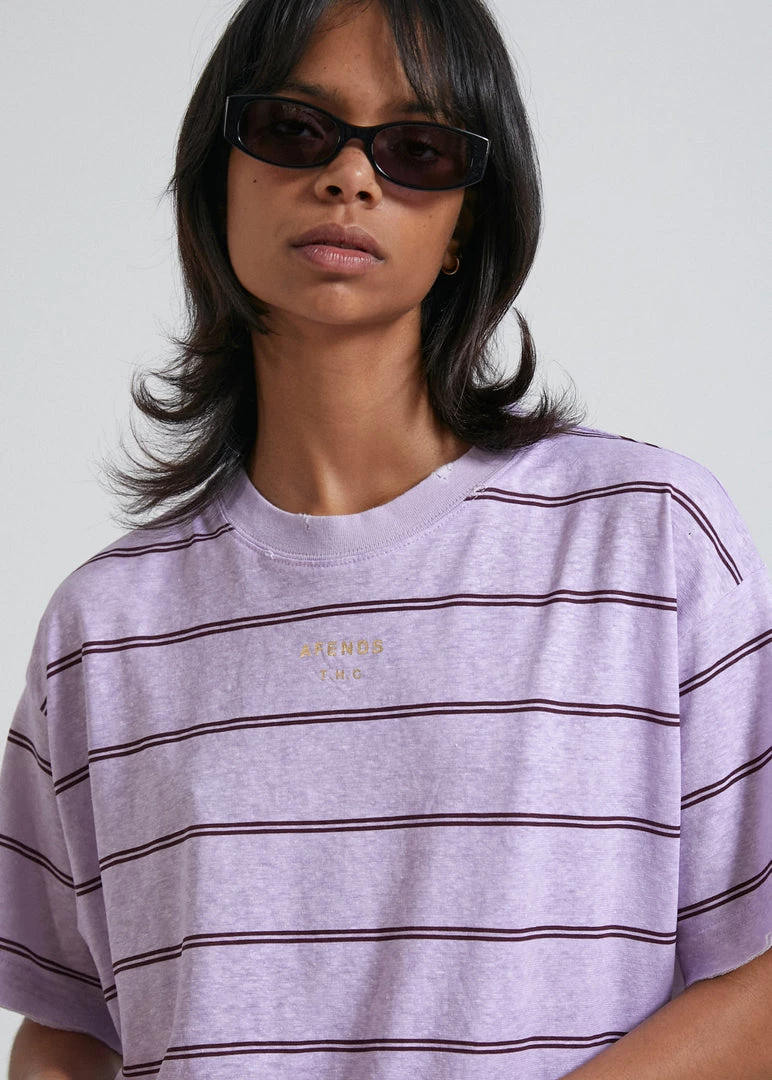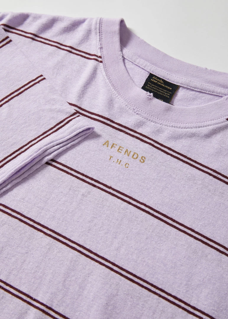 In our staple, oversized silhouette, this midweight short-sleeve tee boasts a relaxed shape, distressed neckline and a raw hem and sleeves. Offering a contrast printed stripe and gold foil Afends T.H.C logo, pair this top with our chocolate brown denim and let the lilac come to life.