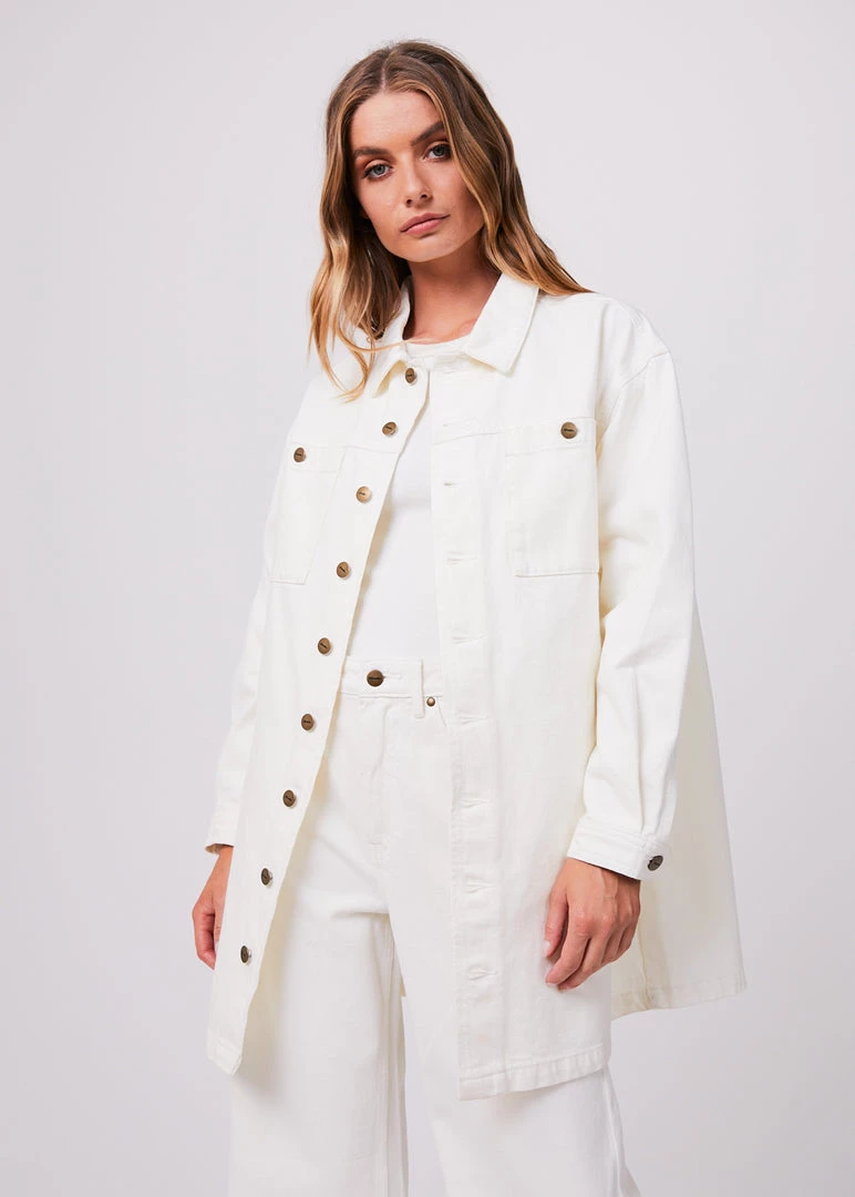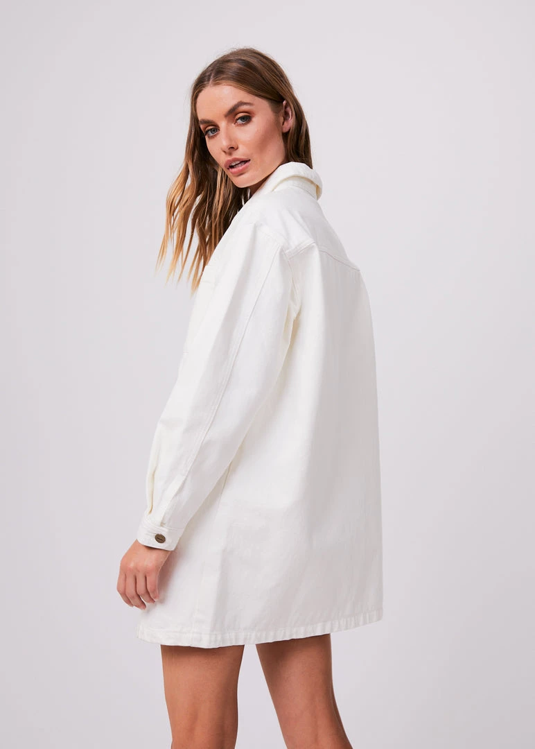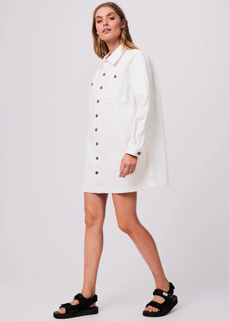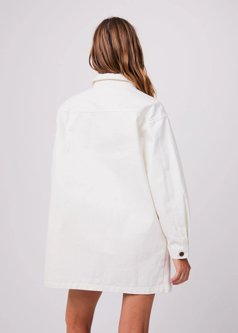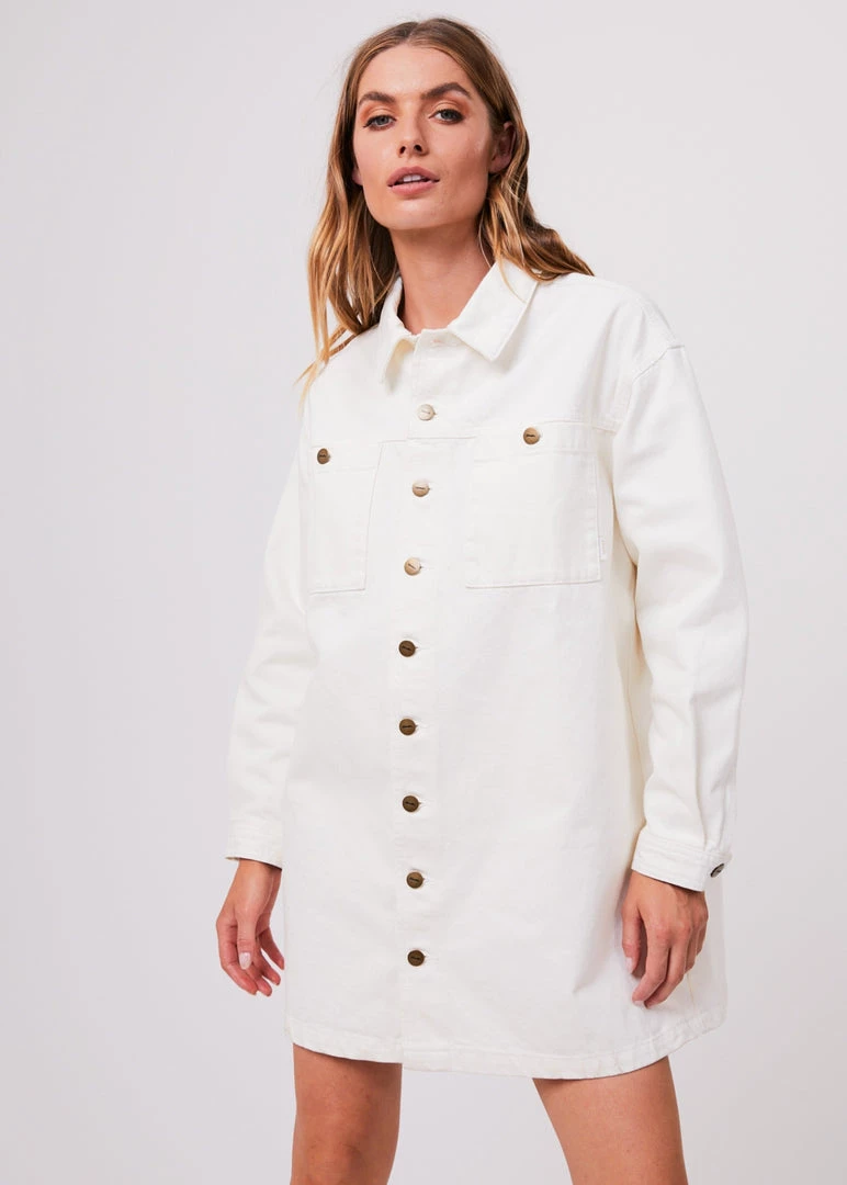 Button it up in the Tori denim dress. Our new dress shape offers a button-up design, mini-length, long sleeves and two oversized chest pockets. Crafted from sturdy organic cotton denim in our crisp off white colourway – this eco-friendly dress promises longevity. Wear it as a dress or unbuttoned as an oversized jacket.