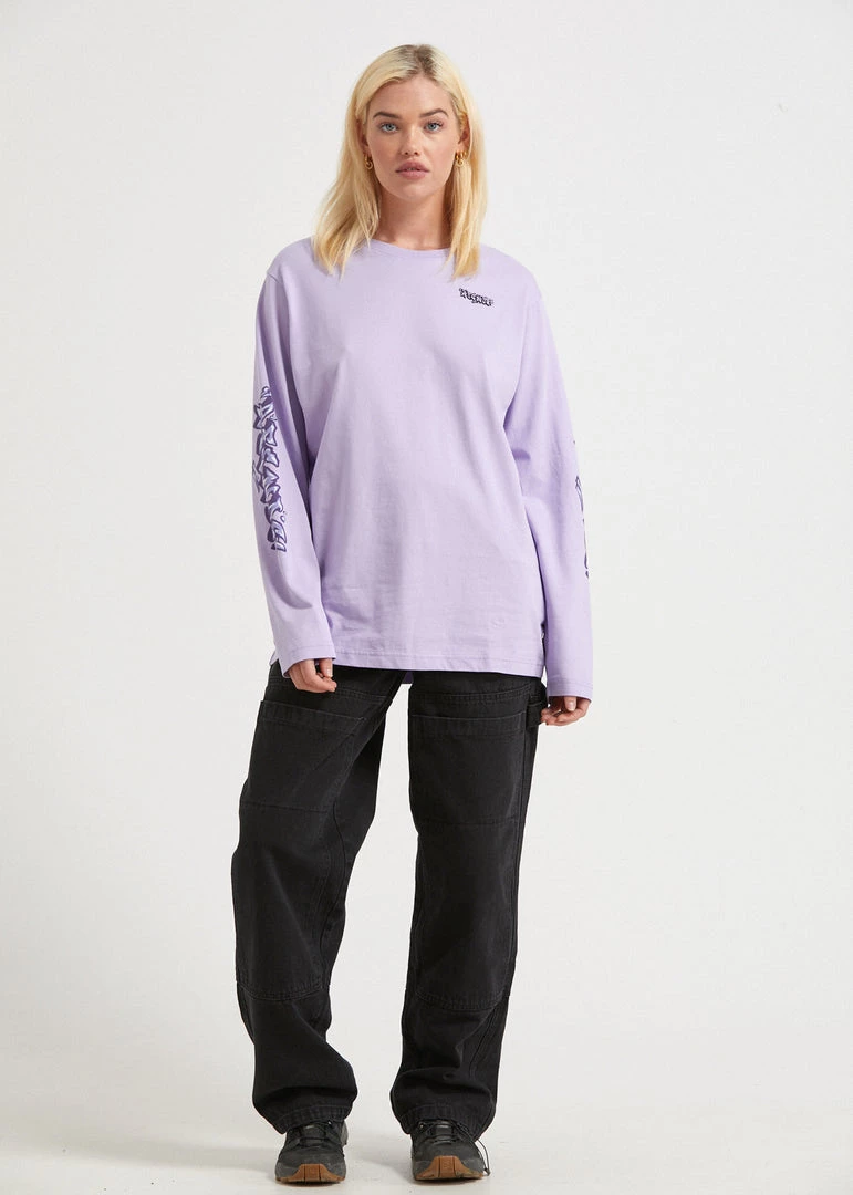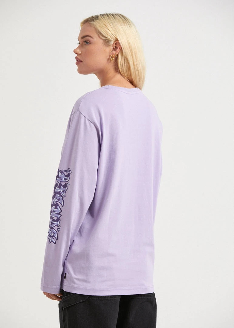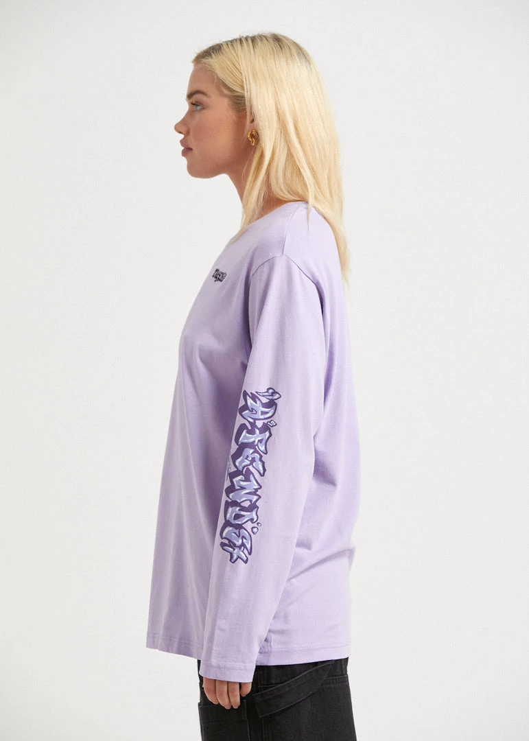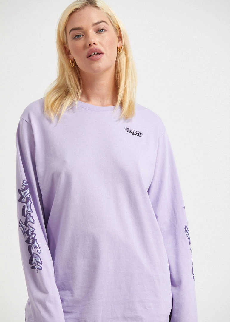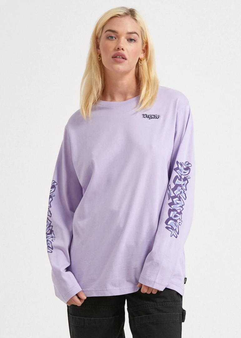 Make tracks in this long sleeve graphic t-shirt. Created in collaboration with our good mate Nirvana Selwood, this t-shirt offers a graffiti style logo to elevate your everyday collection. Our long sleeve t-shirt offers a relaxed silhouette with a soft-hand feel in eco-friendly recycled cotton.
