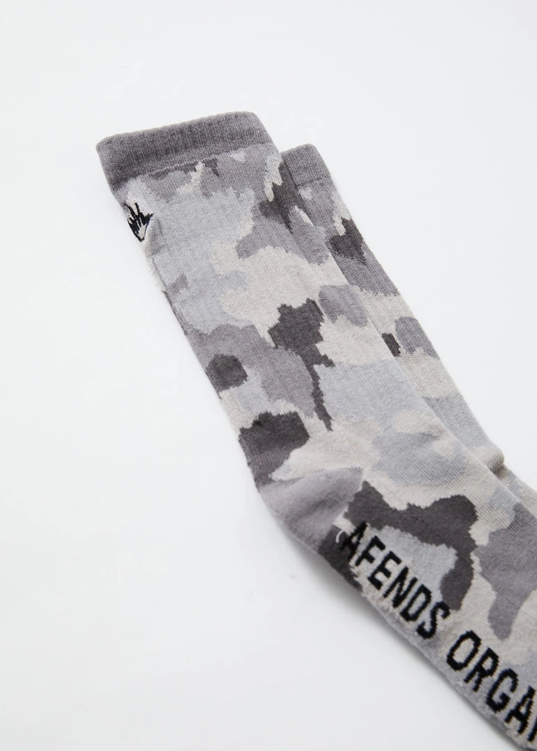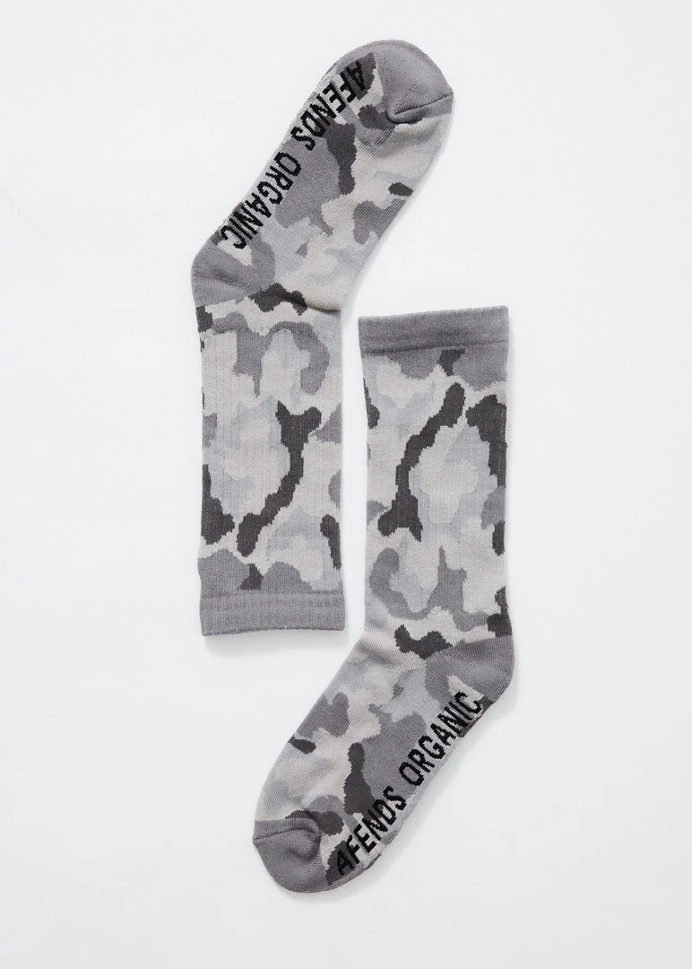 Keep your cover in these crew socks. Our eco-friendly organic cotton fabric offers a slight stretch and cushioning for comfort. Finished in our muted camo print – you can pair these back with our organic camo collection for the ultimate co-ord set.