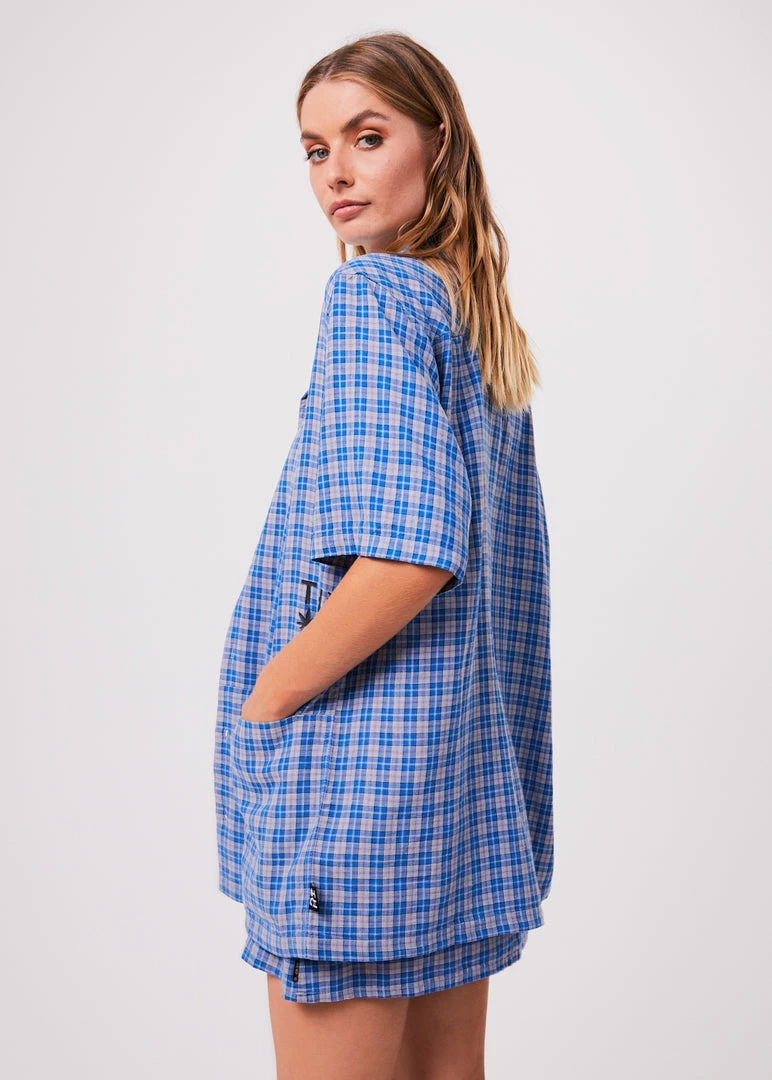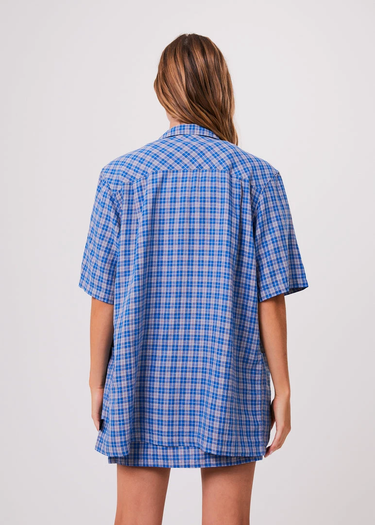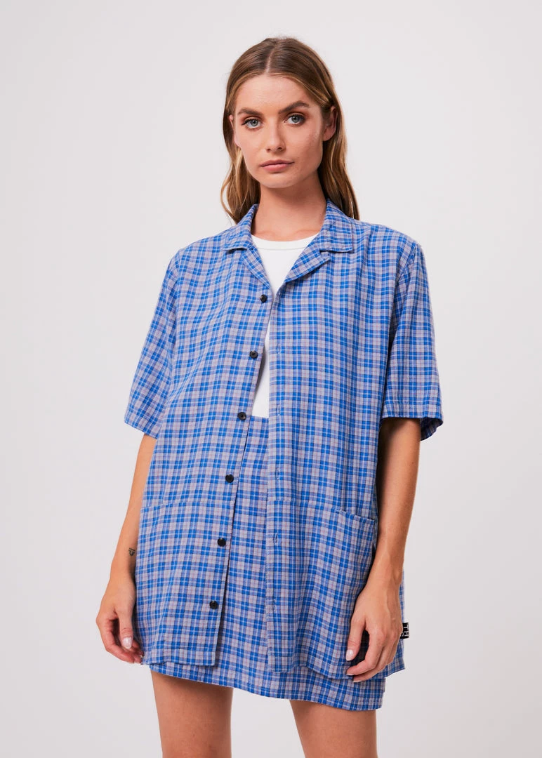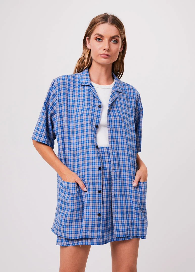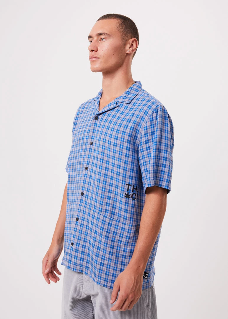 This short-sleeve shirt checks all the boxes. The all-natural blend of hemp and tencel in our electric blue check print offers a super lightweight and breathable to carry you through the seasons with ease. Our unisex short sleeve shirt design offers a relaxed fit, button-up front and THC branding to layer up or button up.