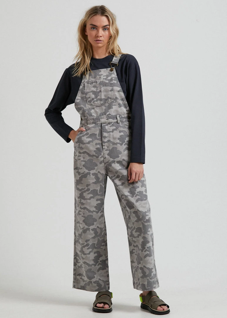 Keep your cover in these overalls. Our eco-friendly organic cotton denim construction offers a midweight and rigid design in our muted camo print. Following our signature overalls silhouette, they are relaxed fitting with a wide leg design, adjustable straps and plenty of pockets. Layer a pop of colour underneath for a bit of fun.
