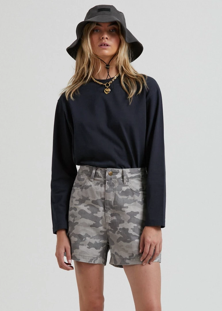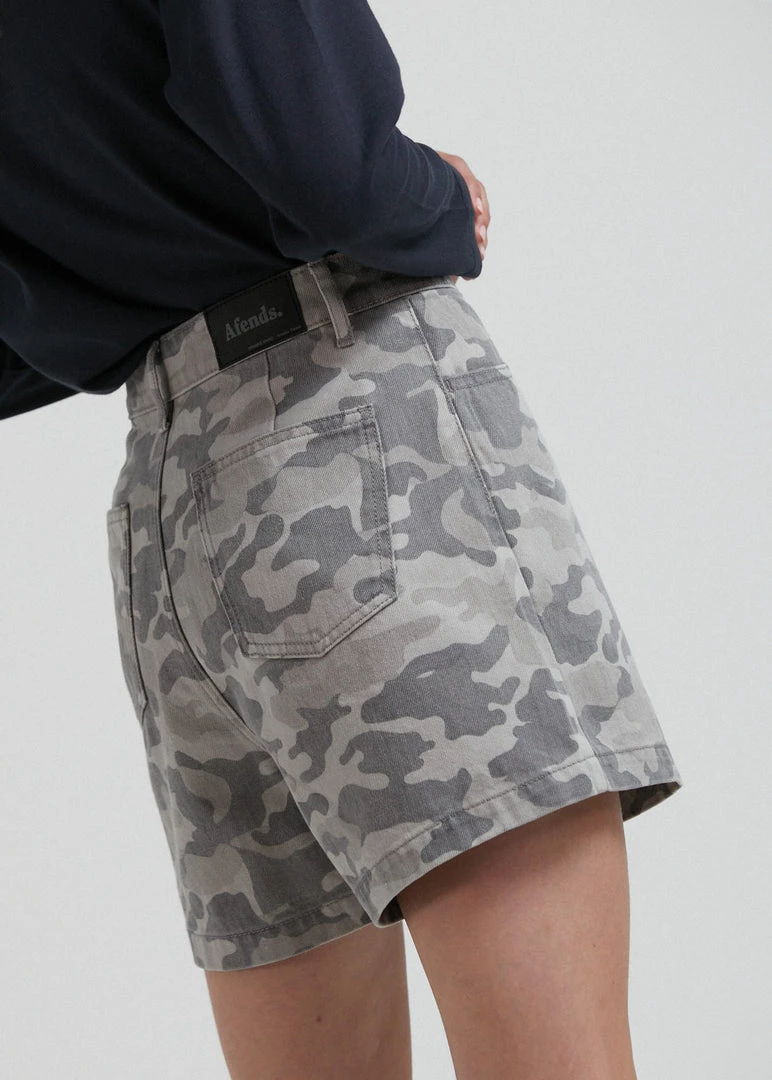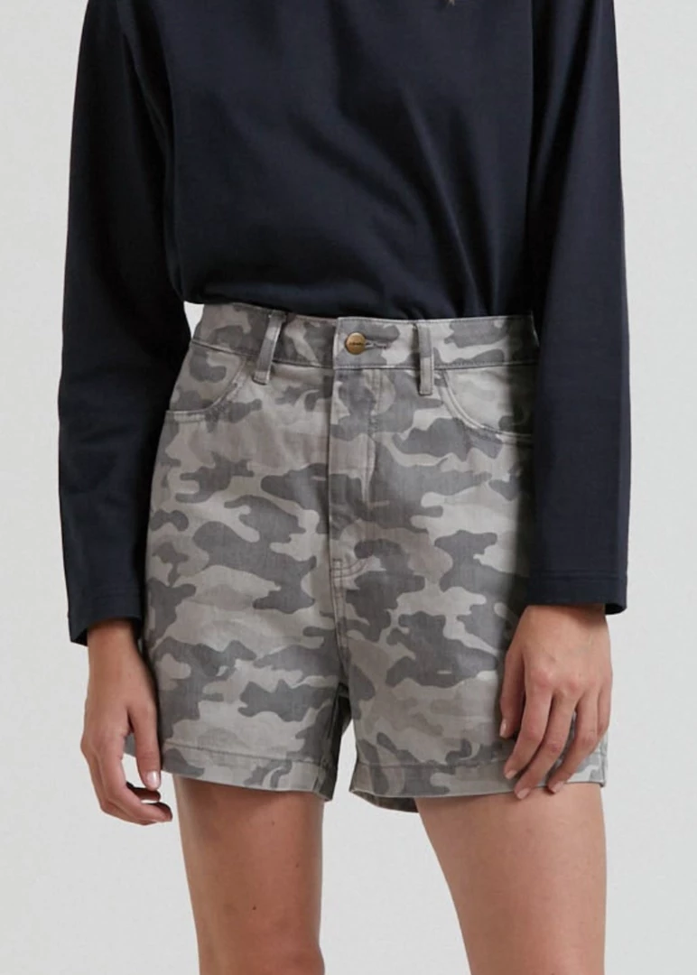 Keep your cover in these shorts. Our eco-friendly organic cotton denim construction offers a midweight and rigid design in our muted camo print. Following our signature Seventy Threes silhouette, these shorts have a high-waisted wide-leg design with plenty of pockets and pair well with a pop of colour.
