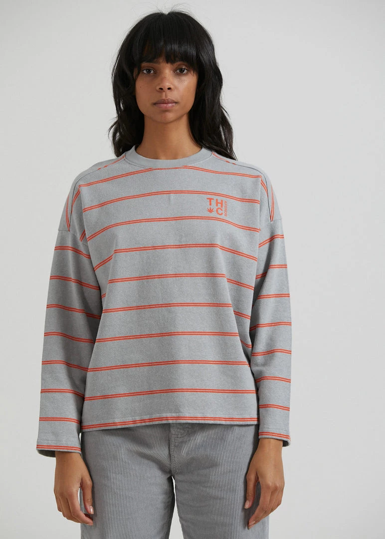 Layer up in the interlude crew neck jumper. Our eco-friendly recycled cotton fleece offers a soft and cosy design to sink into. Following our crew neck silhouette, this jumper features a relaxed fit and pop coral stripes to pair back with our check ribbed range.