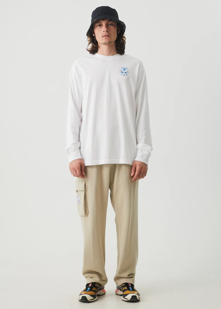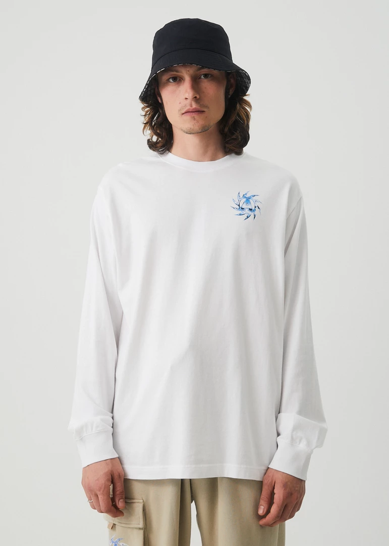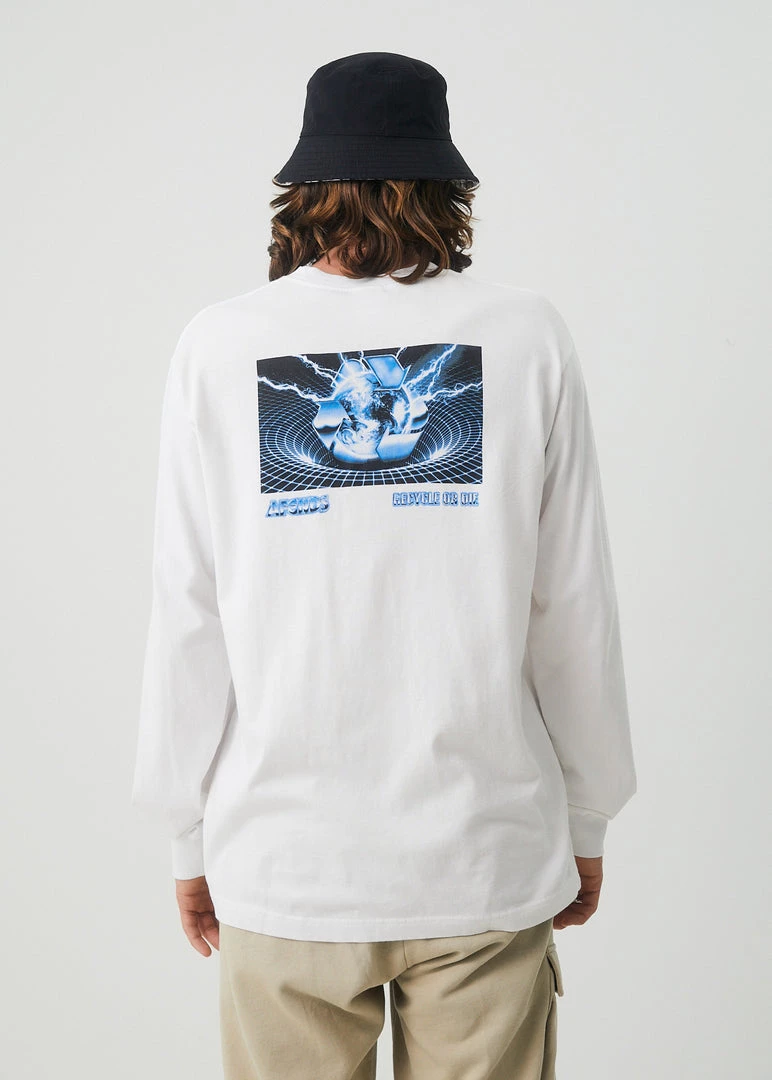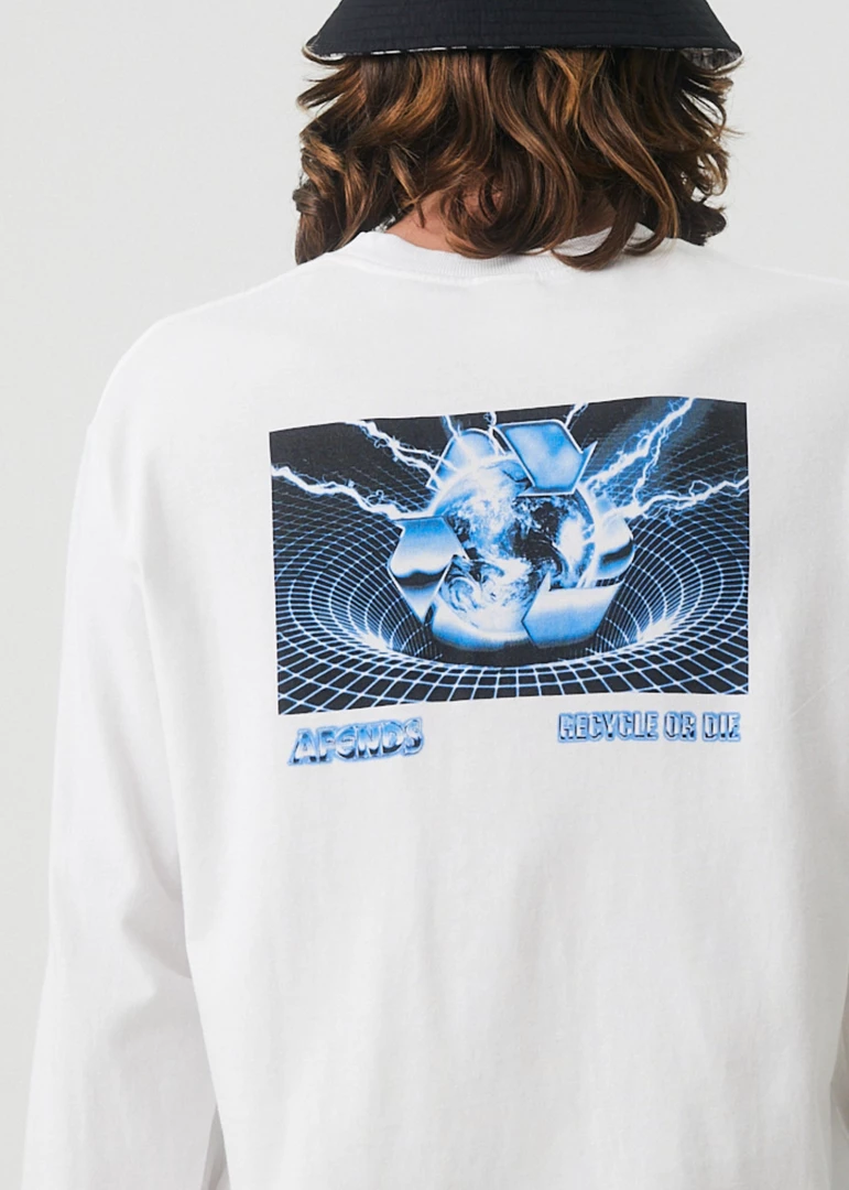 This is not your average long sleeve graphic tee. Crafted from eco-friendly recycled cotton, this tee offers a futuristic take on our core attitude towards becoming more environmentally sustainable through recycled fabric. Our retro fit is relaxed and boxy with back printed graphics to wear on or with a layer.