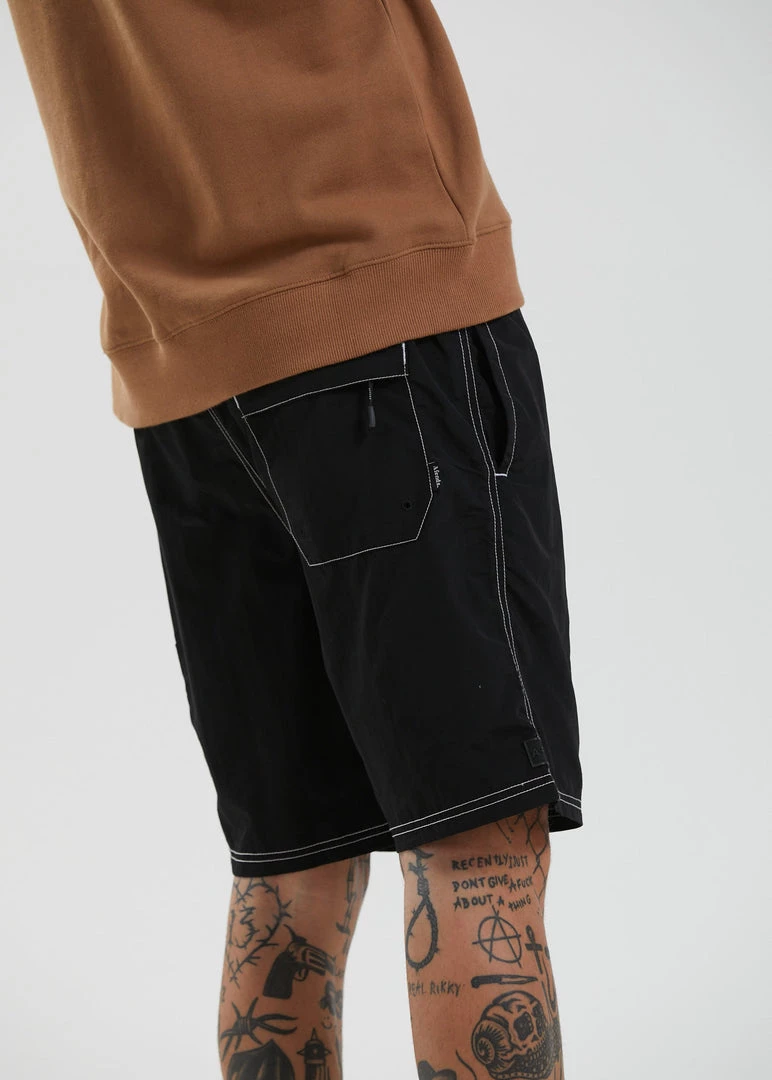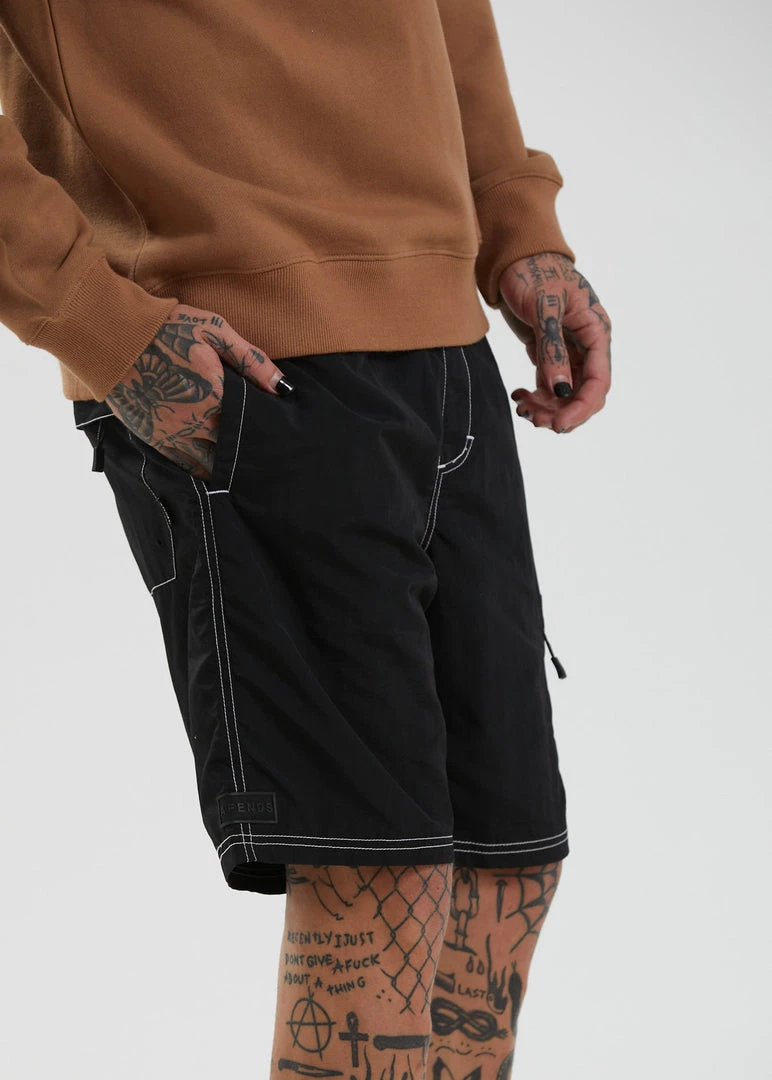 Kick back utility style in these mens shorts. In our signature Baywatch shape, these shorts offer a relaxed fit and elastic waist. Our eco-friendly recycled nylon taslon delivers a super lightweight, breathable and water-resistant design with utility-style trims, contrast stitching and plenty of pockets.